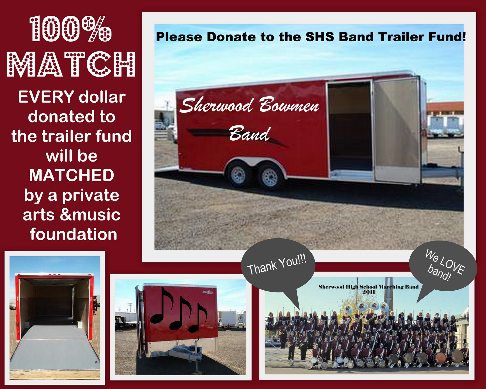 Anyone who donates $500 or more will have their name or business displayed on the trailer and advertised on our website. Take advantage of this opportunity to support our band!